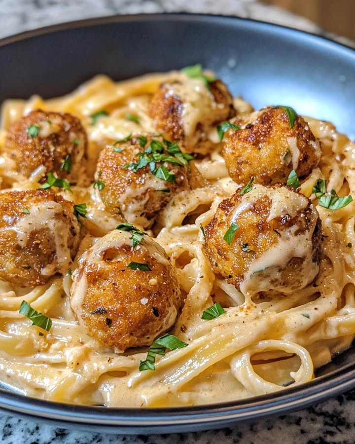 Descubre la receta de Albóndigas Ajo Parmesano, una delicia de pollo con fettuccine en salsa cremosa para deleitar tu paladar