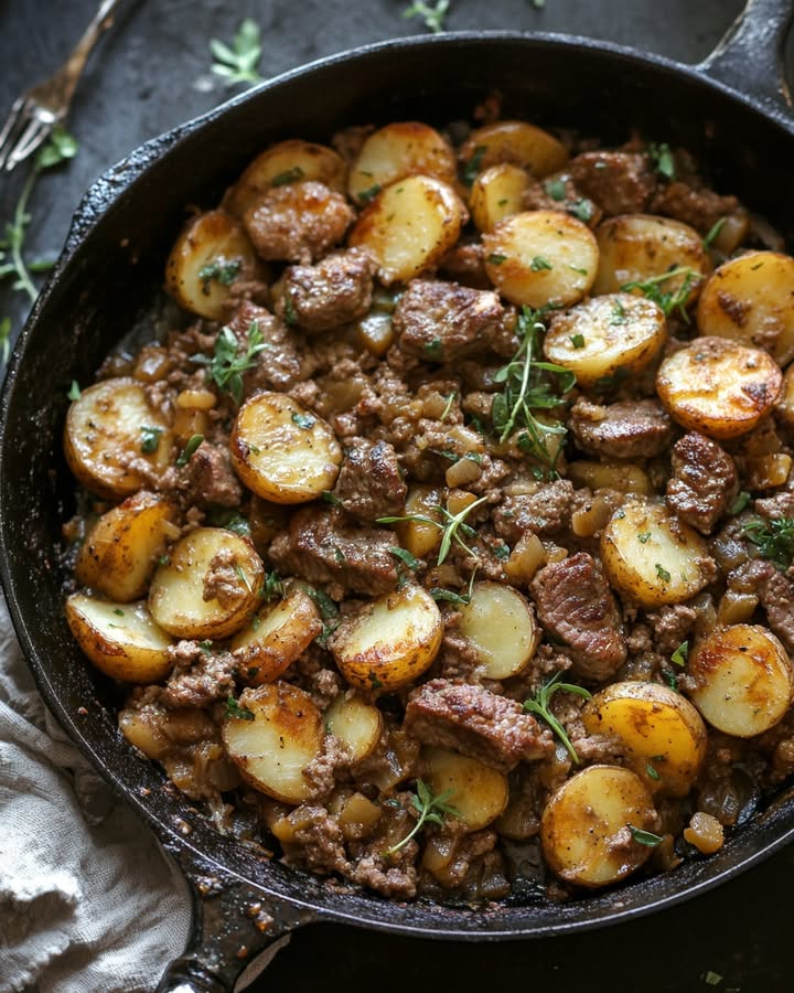 Incorpora las papas picadas y 2 tazas de caldo de res al sartén, lleva a hervir y cocina hasta que las papas estén tiernas, unos 5 minutos.