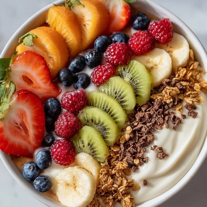 Usa frutas de temporada para el mejor sabor y nutrientes. Corta las frutas justo antes de preparar el bol y puedes agregar miel o semillas de chía para un toque extra. Se disfruta mejor inmediatamente. Si sobran frutas y yogur, guárdalos por separado en la nevera.