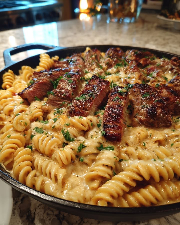 Descubre la receta de Pasta Cremosa Steak al estilo skillet jugosa y rápida perfecta para cenas especiales en familia o con amigos Pasta Cremosa Steak