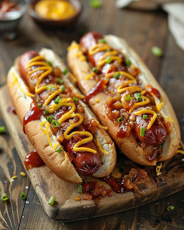Saca los perros calientes del horno y sírvelos calientes con un poco más de salsa si lo deseas.