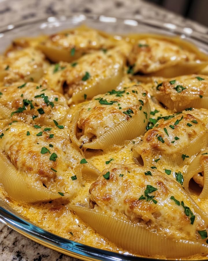 Descubre la receta de Pollo Alfredo Relleno con conchas rellenas de ricotta y salsa cremosa perfecta para cenas familiares y reuniones especiales