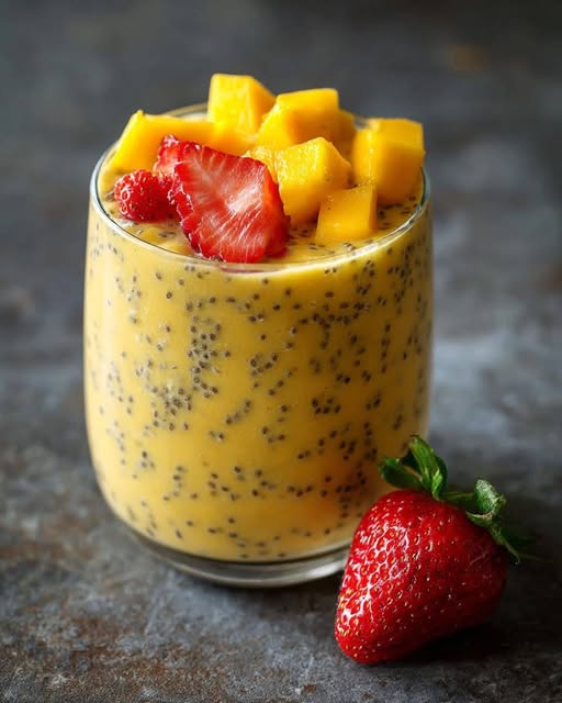 Vierte el pudín en un vaso o tazón. Decora con trozos de mango y fresas cortadas.