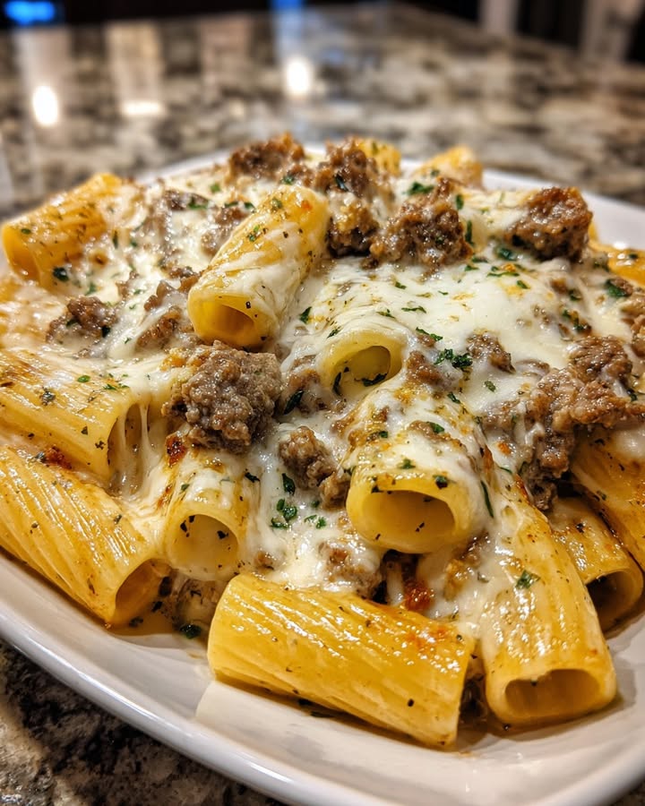 Descubre la receta de Rigatoni Crema Queso con carne picada suave y queso derretido perfecta para cenas familiares y especiales